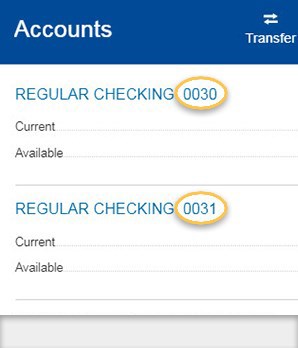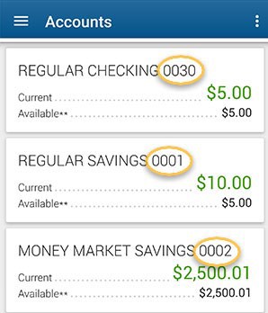 The 4-Digit Account Suffix can be found next to each account, and may be placed differently in your Account Summary for Online Banking, our Mobile App, and Account Statements. The photos below illustrate only the location of where the account suffix resides.