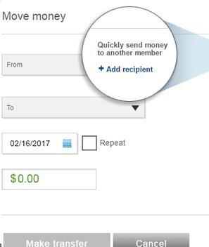 On the right side of this screen, you can click on + Add recipient to quickly send money to another member not saved in your account transfer list.