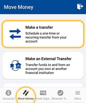 and Login using your preferred method: Fingerprint/Touch ID, Eyeprint ID, or credentials. From the menu bar, tap Move Money then Make a transfer.